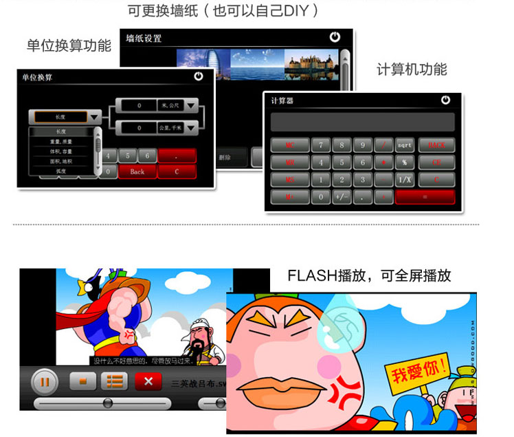 Movies: Support RMVB/WMV/ASF/AVI etc play; Adjustable broadcast schedule/pause/full screen playback video files