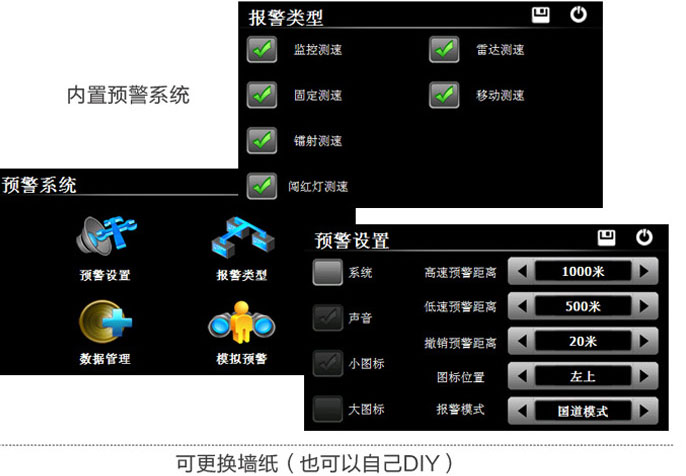 GPS Navigation Radar All-In-One; Latest apple system; Navigate and locate; Fast searching singal; Route planning; Genuine national data; Timming traffic light alarm; Flowing camera; 1,000 meters warning voice add pictures tip; Real-time mileage; Tollbooth; Rest area; Dangerous sections tip; MP3 MP4; Many games; Navigation voice can meet the original car stereo