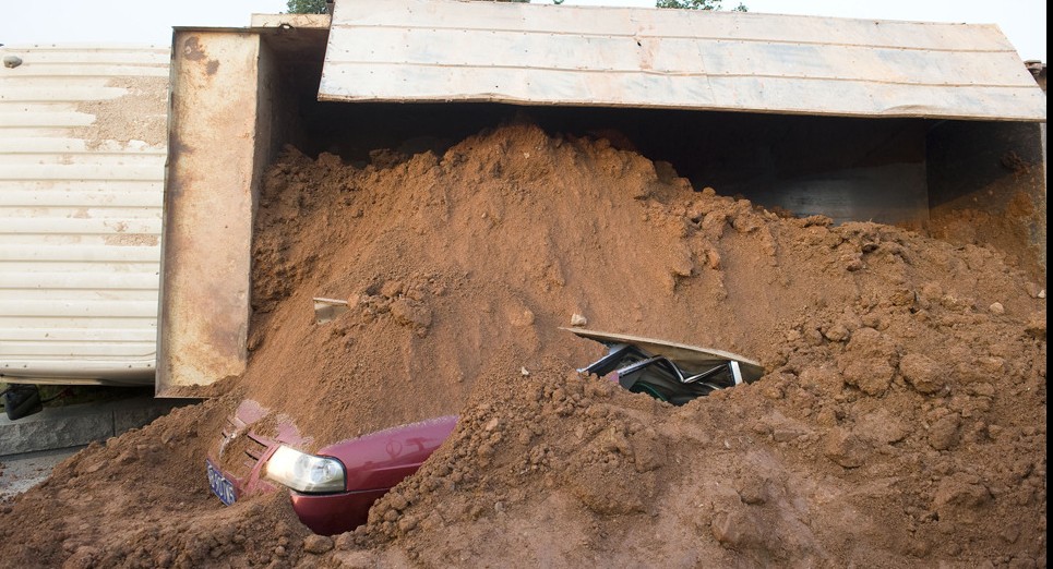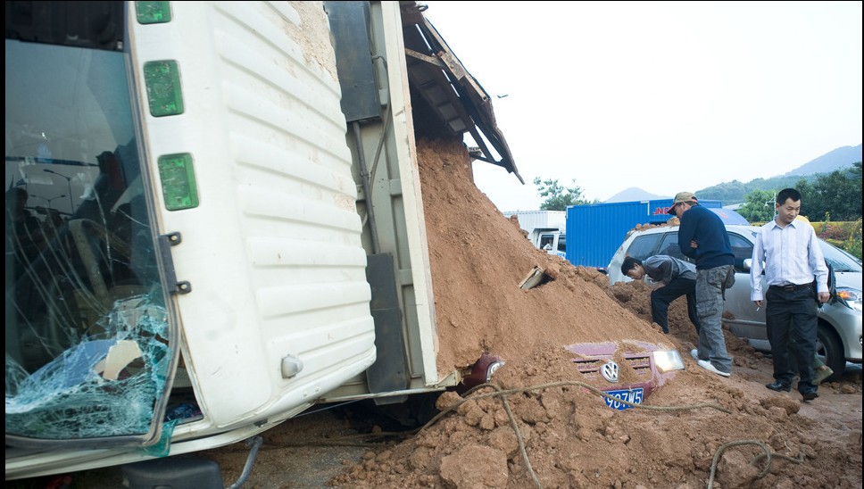 昨日下午4時40分,南都記者在現場看到,泥頭車鏟上了右側路邊的草坪斜坡,鏟出了一個大坑。泥頭車車身翻側,車上的泥土全部傾瀉到底下的一輛出租車上,而出租車車身被壓扁變形,被深埋在泥下,只有車頭車尾可見,兩輛車前大燈依然亮著。出租車旁邊還有輛夏利小車,車頂也披著一層薄薄的泥土,車尾凹陷。