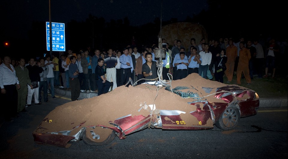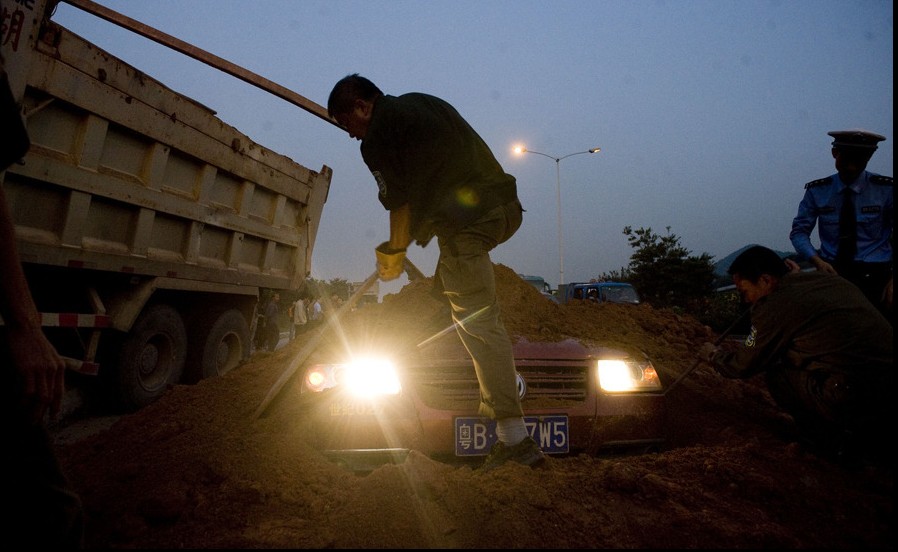 下午5時55分許,交警部門將出租車從掩埋的泥土中清出,吊車將出租車吊離了事故現場。