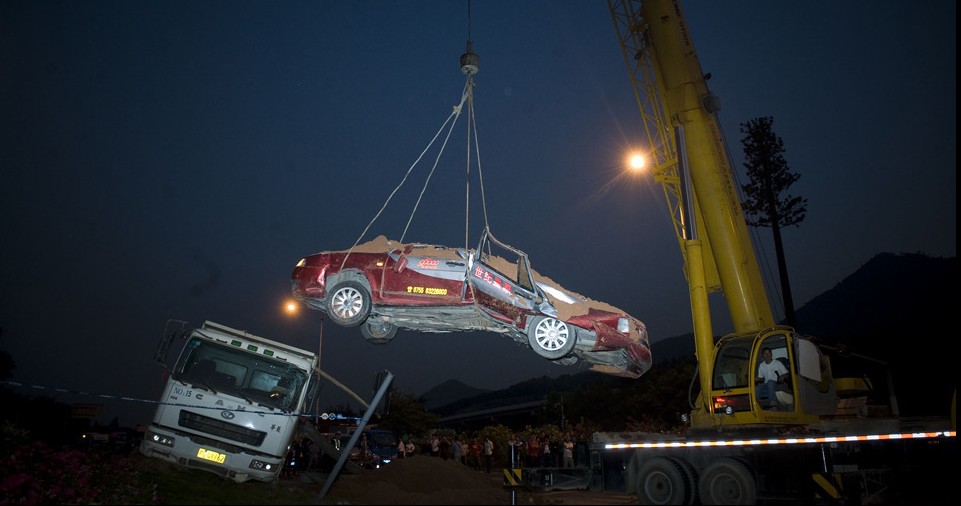 出租車被壓扁,工作人員把小車吊到空曠的地方進一步調查 南都記者 陳文才 攝