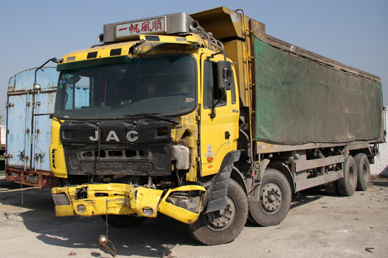 在黎湖工業區一停車場內,記者還找到了事發的兩輛車。肇事的6輪貨車車頭左下角被撞出一個凹痕,車頭護欄垂落,一個車燈被撞出。